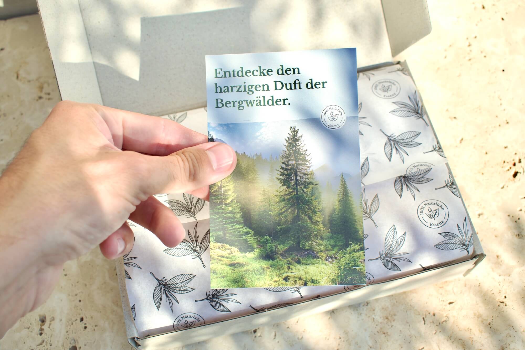 Ein Mann legt einem Paket mit dem naturreinen ätherischen Duftöl Waldspaziergang eine handgeschriebene Grußkarte bei