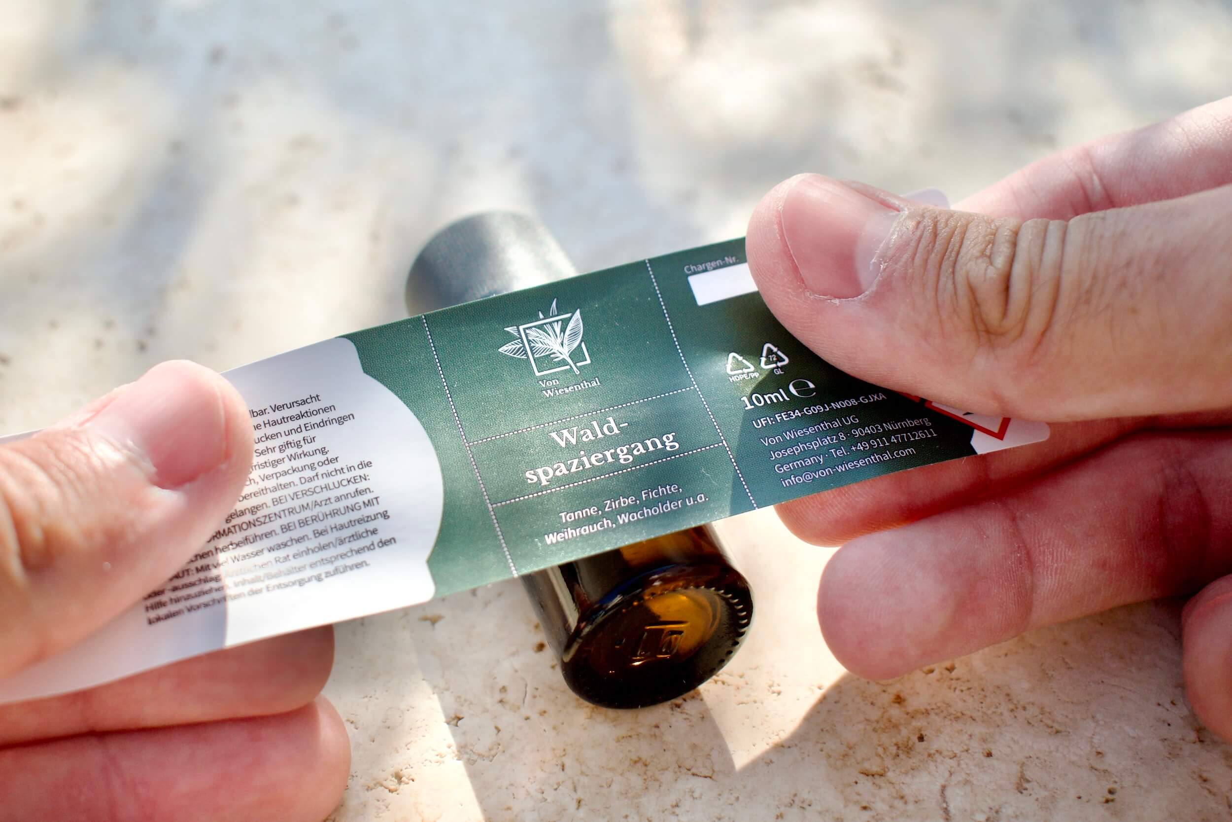 Ein Fläschchen des alpinen Duftöls Waldspaziergang wird in der Manufaktur etikettiert